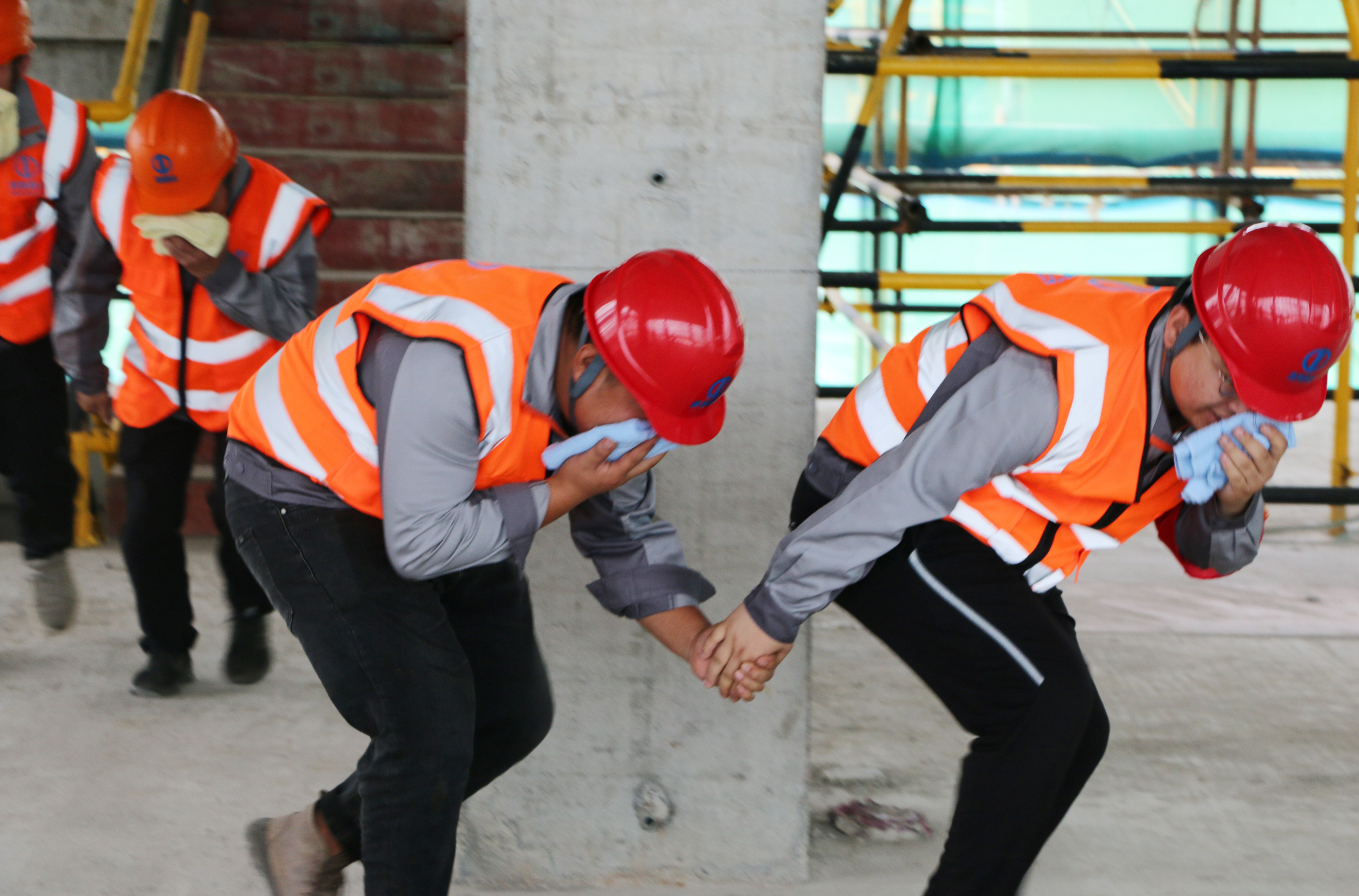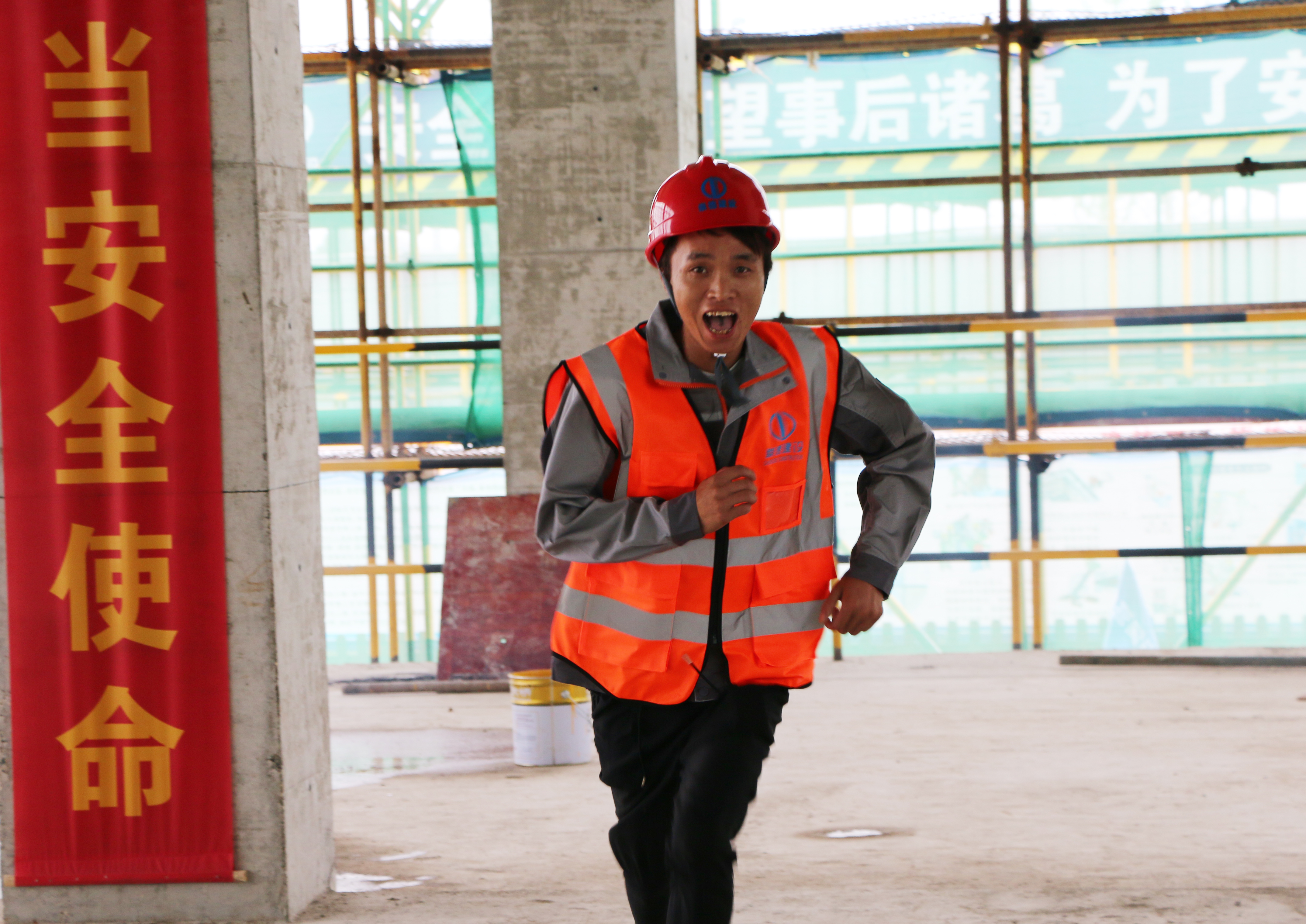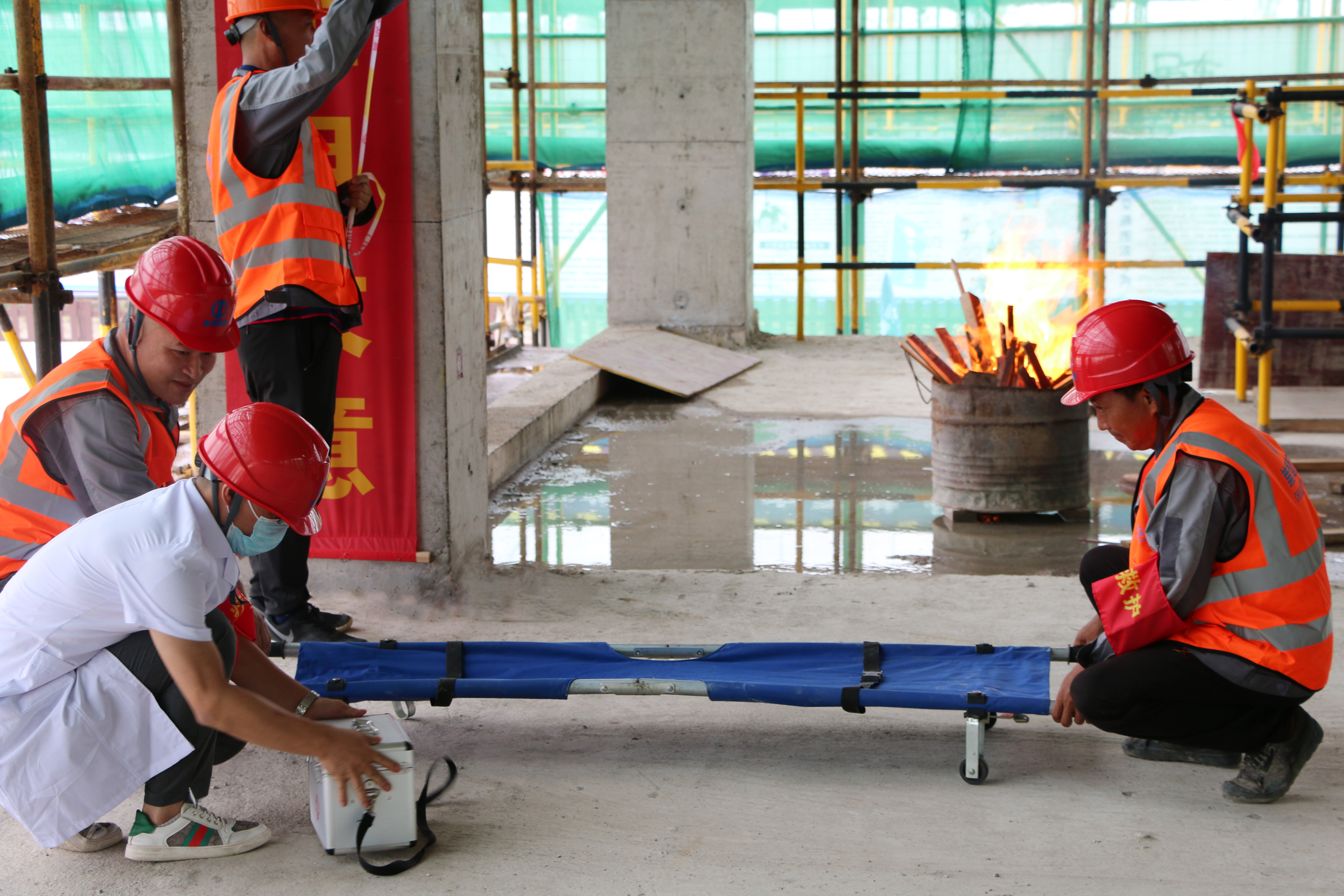 情景模擬的是:在主體施工階段,施工現(xiàn)場樓層面鋼筋電渣壓力焊的電渣火星,不慎掉落至樓下拆模模板堆放區(qū)域,導致火災發(fā)生。
